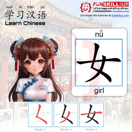 Cara Menulis hanzi Mandarin nǚ (wanita)